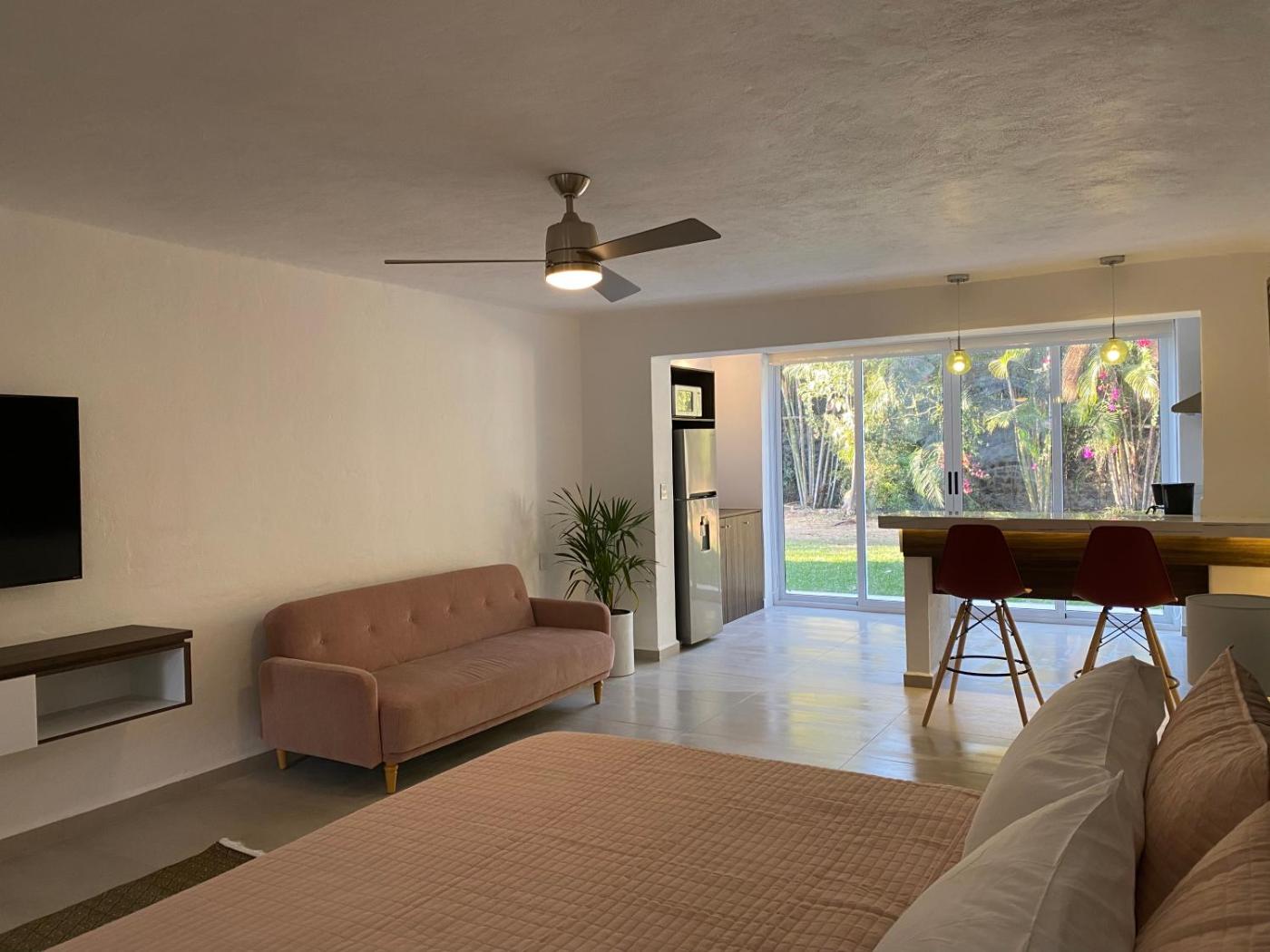 Studio with Garden View. This spacious suite features 1 living room, 1 separate bedroom and 1 bathroom with a shower and free toiletries. Meals can be prepared in the kitchen, which has a refrigerator, kitchenware and a microwave. The air-conditioned suite features a flat-screen TV with streaming services, a coffee machine, a dining area, a wardrobe as well as garden views. The unit has 2 beds. ;